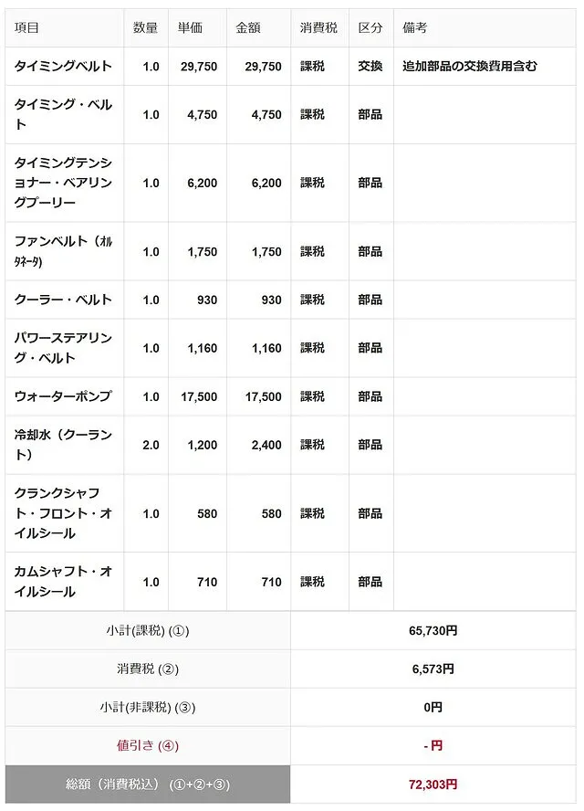 タイミングベルト交換時、追加整備としてファン/クーラー/パワステ・ベルト交換・ウォーターポンプ交換・クランク&カムシャフト・オイルシール交換・テンショナーベアリングプーリーも同時交換します。