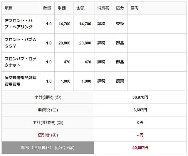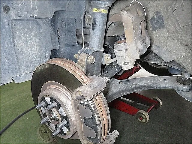 車両をジャッキアップして、フロント足回り診断の結果、左フロント・ハブにガタがあり、異音を確認いたしました。左フロント・ハブ・ベアリング 交換となりました。