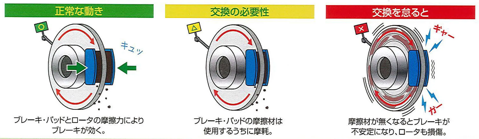 パッドが磨耗したままにすると、ブレーキ時にブレーキ鳴きの異音がします。最悪ブレーキが効きにくくなり危険です。また、