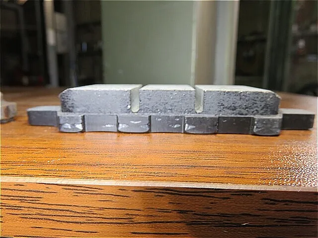 磨耗したブレーキパッドと新しいブレーキパッドの比較です。 新品は、厚み10mm。取り外したパッドの残量は3mmでした。