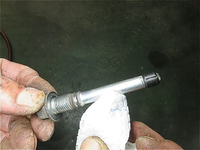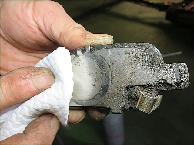 ブレーキ・パッドへブレーキ鳴き防止のため、パッド専用のグリスを塗布し、 パッドの面取り加工をしてパッドを組み付けます。