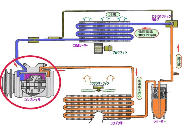 コンプレッサーASSYを交換いたします。できるだけコストがかからないように「純正部品」ではなく、保証付き「リビルト品(再生品)」にて交換する事となりました。