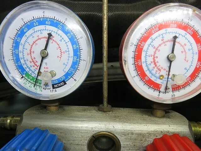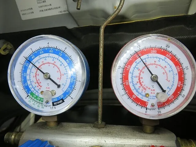 エアコンガス・量/圧力をゲージマニホールドを使用して測定(圧力ゲージ)。 ガス量は、ありましたが、高圧ガスの圧力が上がらなく、 エアコン・システム診断の結果、コンプレッサーが時々作動していませんでした。