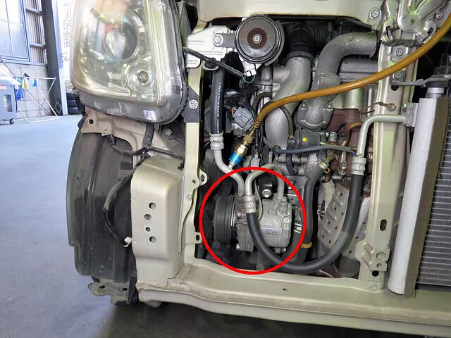 呉市 呉市 エアコンコンプレッサー交換 リビルト品 スズキ パレット 第一自動車