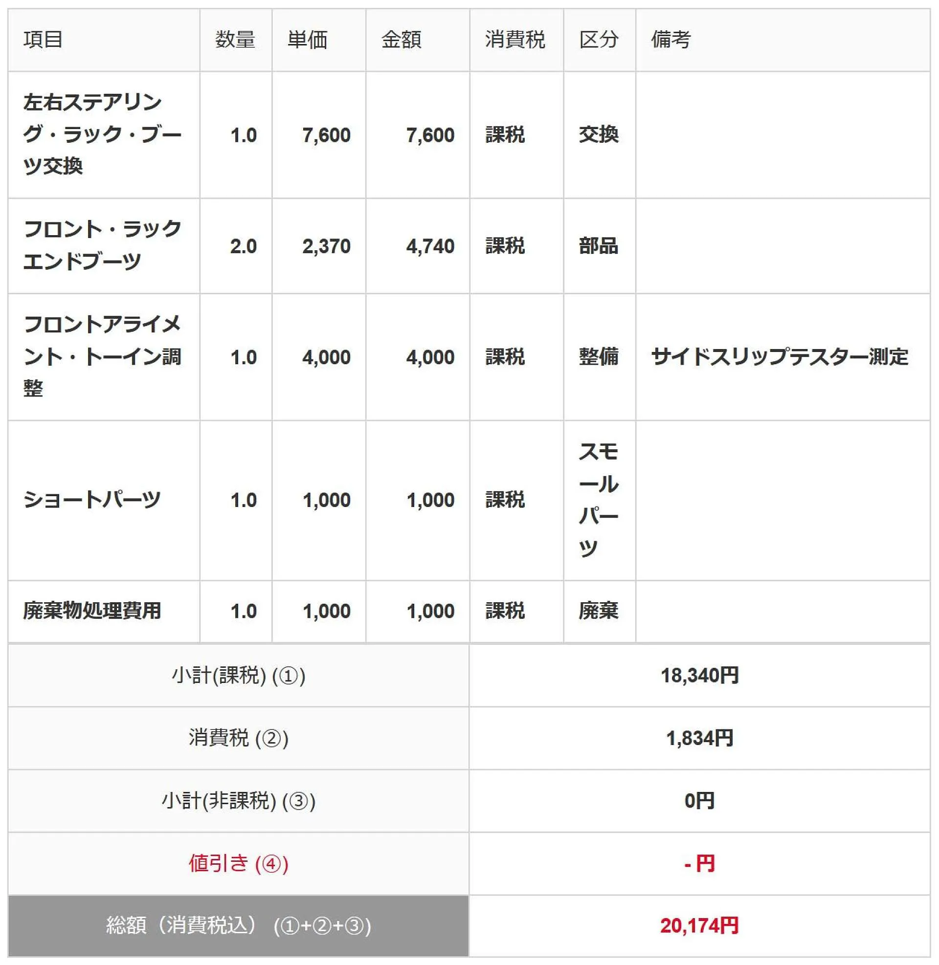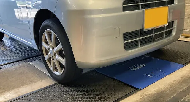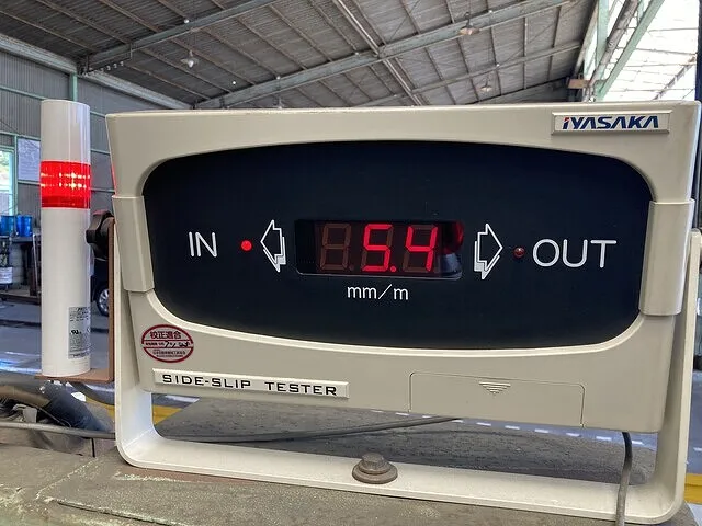 サイドスリップテスターにてフロントアライメント測定、タイロッドの長さを調整してトーインを基準値内にします。