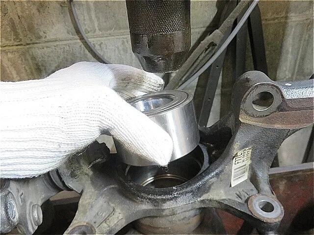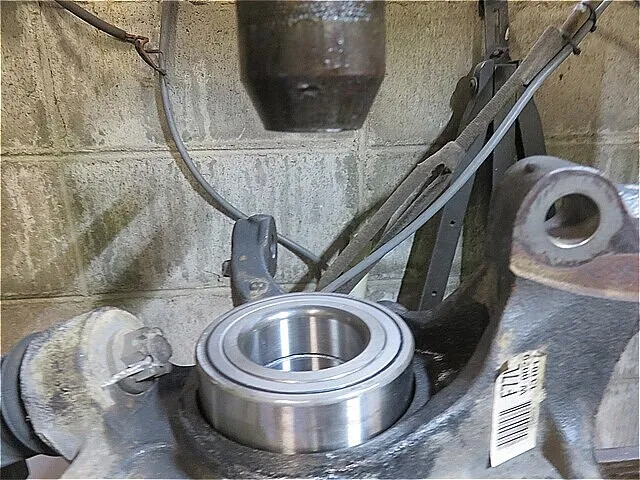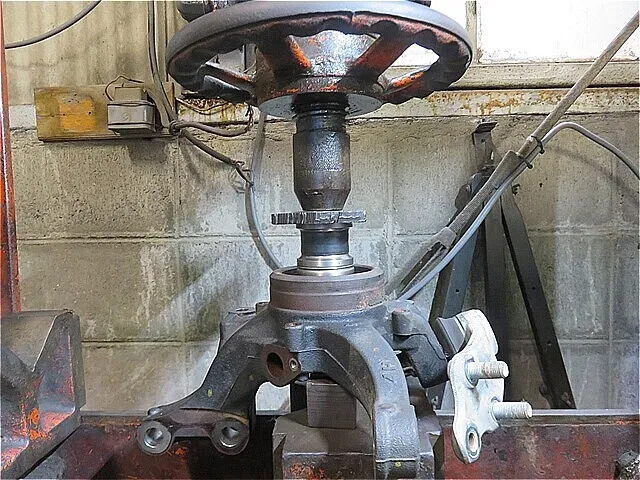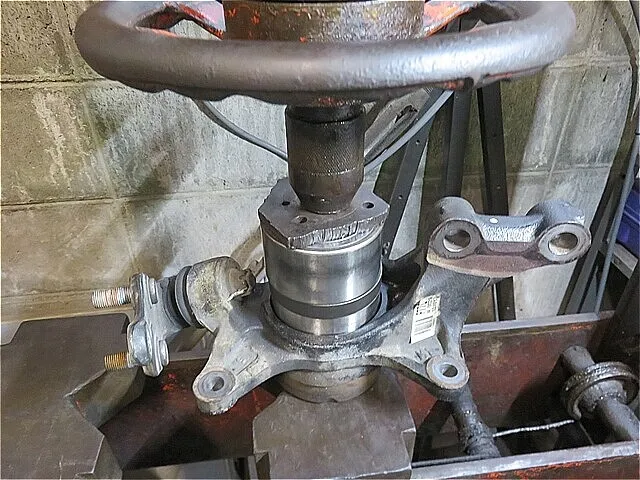 フロント・ナックルASSYへ「新しいハブ・ベアリング」を圧入しながら慎重に組み付けます(プレス機を使用します。)
