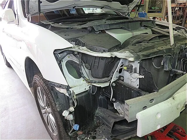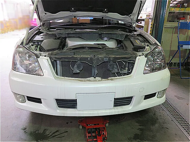 右ヘッドライト取り外しのため、フロントバンパーを取り外します。