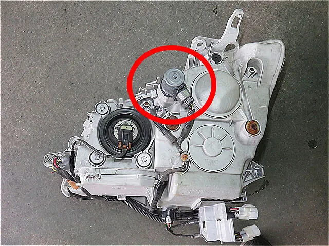 右ヘッドライトの裏側に故障したスイブルモーターが確認できます。