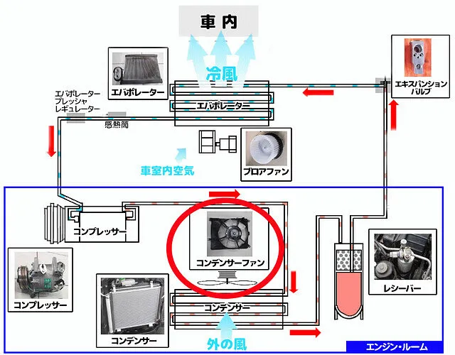 エアコン・システム診断結果、クーラーコンデンサ冷却ファンモータ(ラジエーター冷却ファン兼用)が時々作動していませんでした。