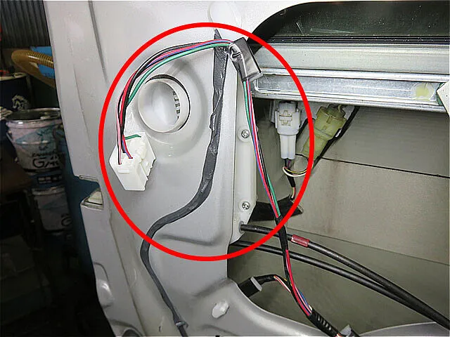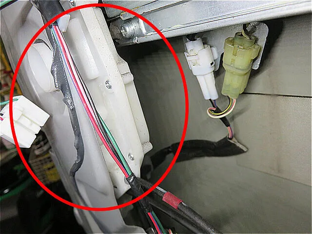 左フロントドアの内張りを外して、ドアロックの配線コネクターやスイッチに問題がないか詳しく点検しました。ドアロックモーターにはしっかり電源がきていることを確認。念のためモーターに直接電源を流してみましたが反応せず、最終的にドアロックモーター本体の故障と判断しました。