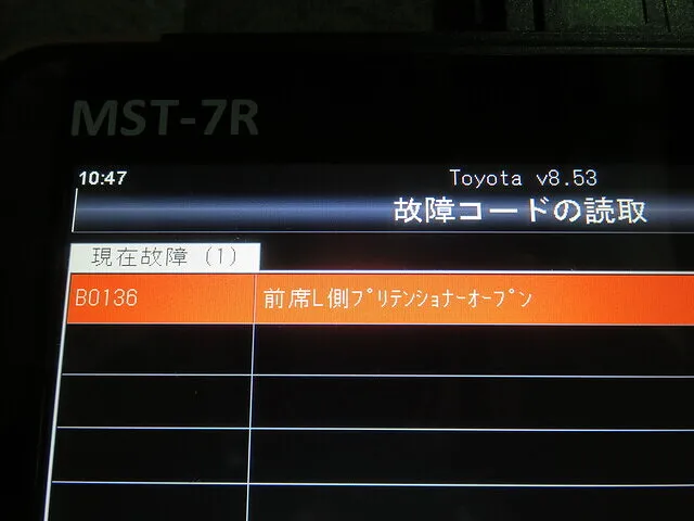 画面には「B0136」と表示されていて、これは前席L側プリテンショナーオープンというエラー内容です。普段は見慣れない数字や用語ですが、私たち整備士にとっては大切な手がかり。