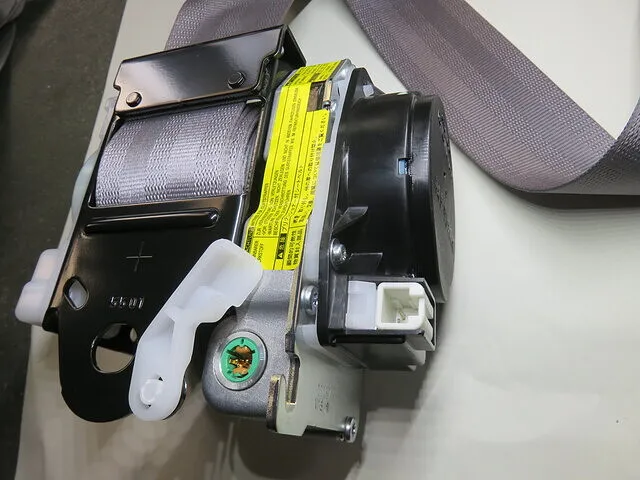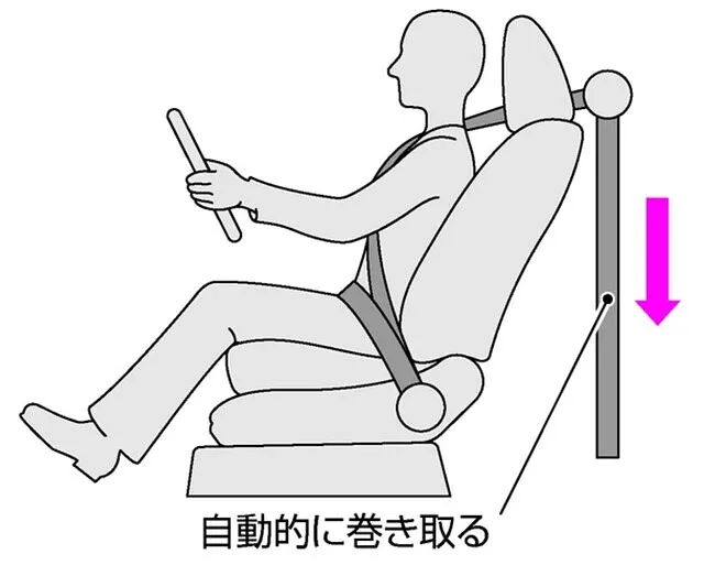 正面衝突などで車両前方から強い衝撃を受けたときに、装着したシートベルトを瞬時に巻き取り、
