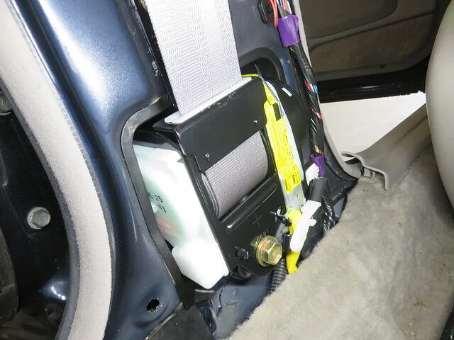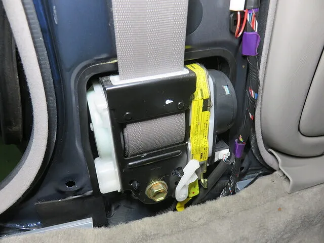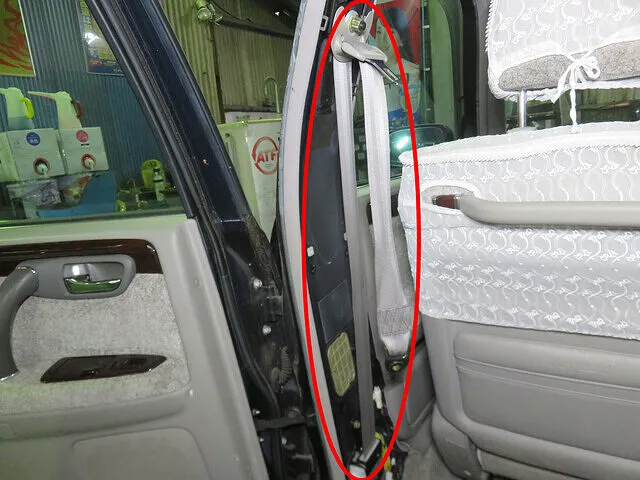 助手席プリテンショナー・シートベルトASSY(配線含む)交換する事となり、助手席のプリテンショナー・シートベルトを取り外します。