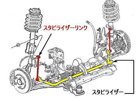 【スタビライザー】このスタビライザーの役割は、車のロールを抑えて走行安定性を良くしている。(車の横揺れによるふらつきを抑える働きをする)