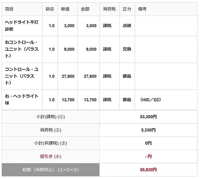 ヘッドライト本体の下側に取り付いているコントロール・ユニット(バラスト)を左右入替てヘッドライトの点灯確認した結果、右ヘッドライト・コントロール・ユニット(バラスト)の不具合が判明しましたので、新品部品(純正部品)への交換作業を実施する事となりました。