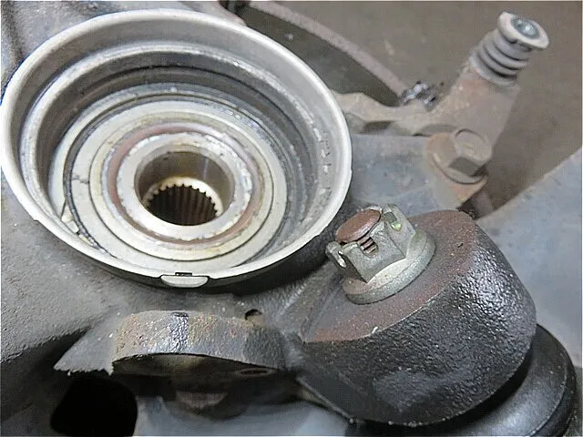 ナックルのハブベアリングカバーを取り外します。