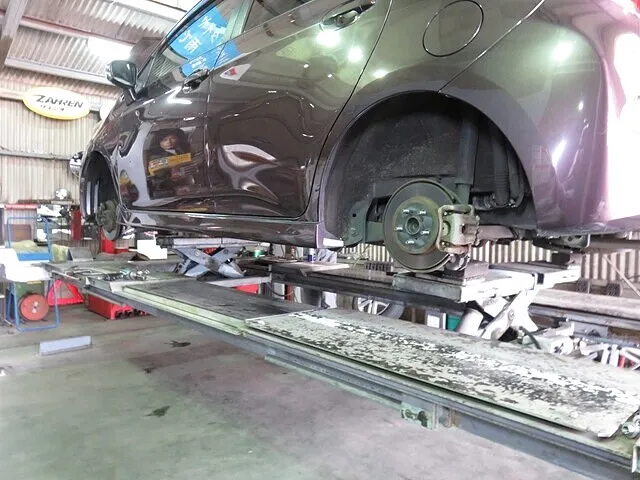 特殊4柱リフト(パンタリフト付き)により車体を設置して、ブレーキパッド交換の整備をはじめます。