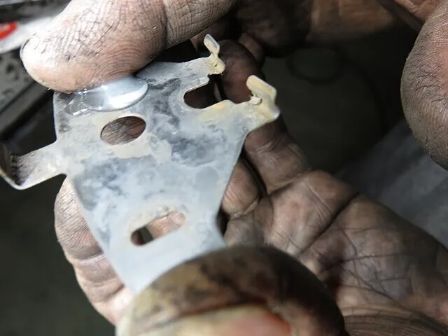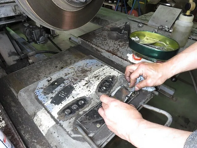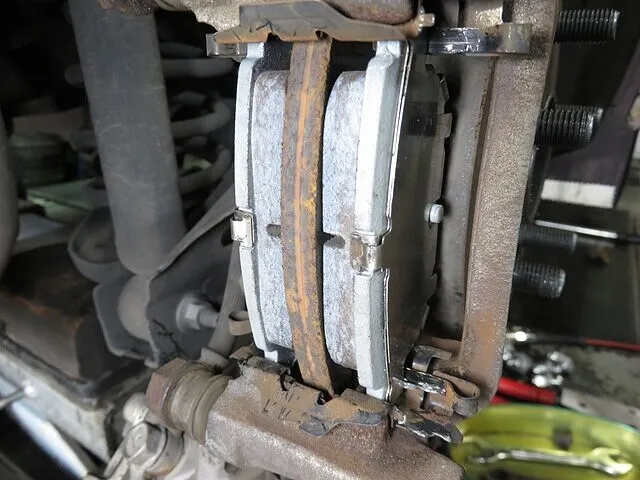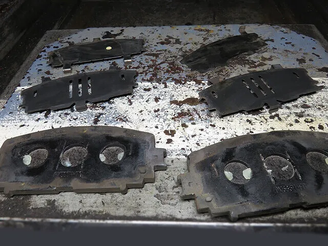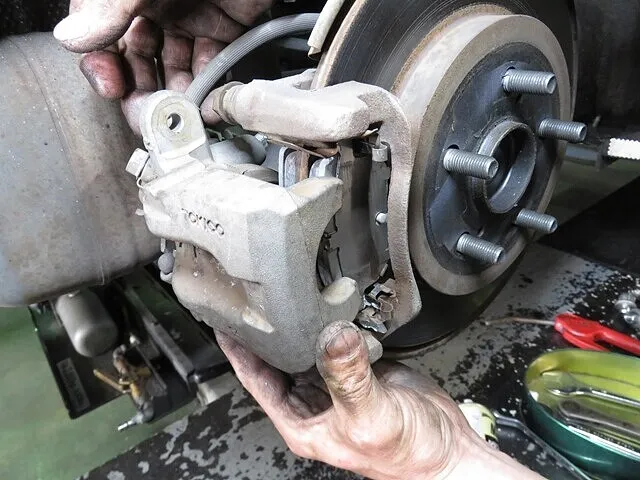 ブレーキ分解整備、キャリパーを取り外し、古いブレーキパッドを取り外します。