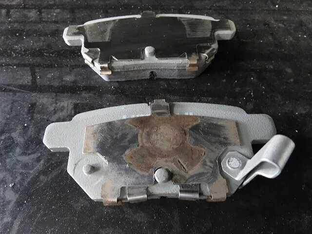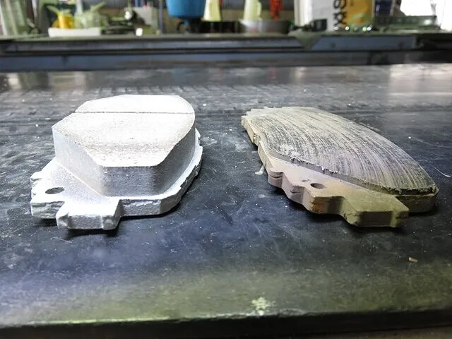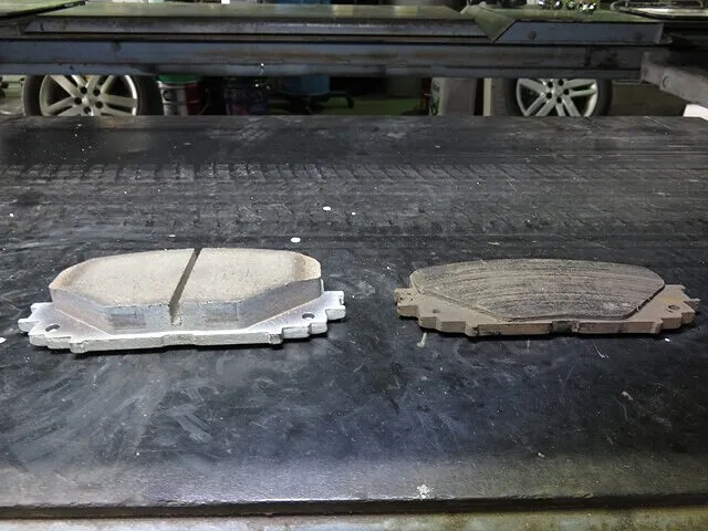 新しいブレーキパッド(厚み10mm)と古いブレーキパッド(厚み2mm)を比較。