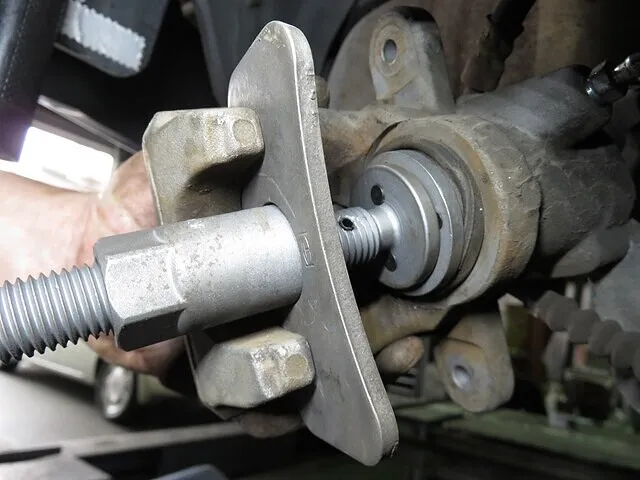 パッドを取り付ける前に、キャリパー内のピストンがを特殊工具(ブレーキピストンツール)にて押し戻します。キャリパー内には、パッドを押さえつけるピストンがあり、新しいパッドを取り付けるため突出しているピストンを押し戻す必要があります。