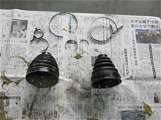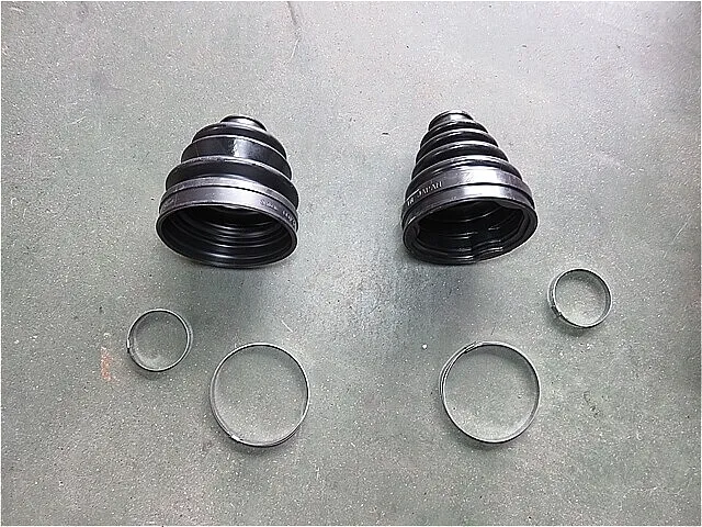 ドライブシャフトの内側と外の取り外したシャフト・ブーツと新しいシャフト・ブーツとブーツバンド