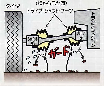 【役割】車にはエンジンの力をタイヤに伝えているドライブシャフトという部品があり、ドライブシャフトには可動部(ジョイント)がついています。ジョイントは金属同士が激しく擦れ合うため潤滑剤(グリス)が詰められており、ドライブシャフトブーツはその潤滑剤が外に漏れないようにする役割と雨水や異物が混入するのを防ぐ役割もしています。