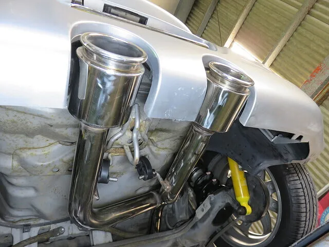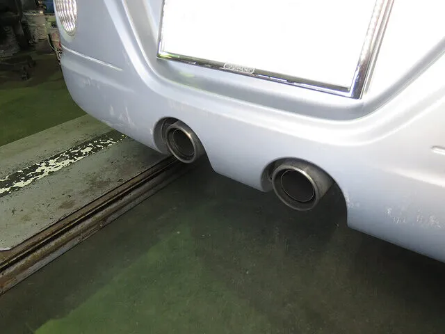 マフラーを取り外し作業前に、車両をリフトアップして、テールマフラーとリヤバンパーが干渉しないように保護します。